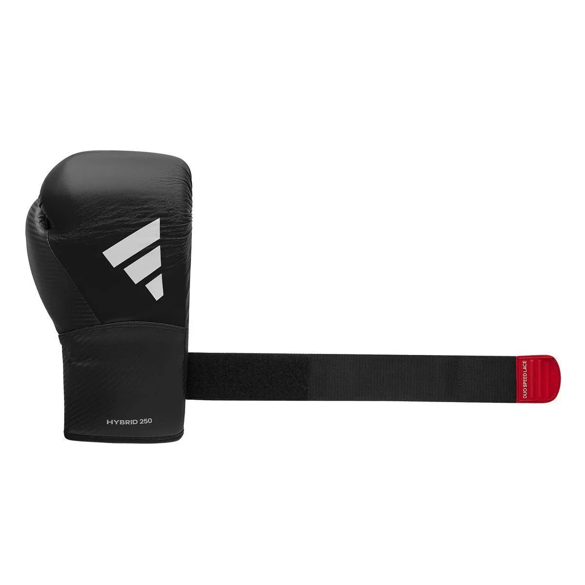 Het bijzondere aan de adidas Hybrid 250TG bokshandschoenen is het nieuwe en unieke “Duo Speed”-sluitsysteem. Dit systeem combineert een nylon wikkelriem-vetersluiting met een klittenbandsluiting en maakt het mogelijk om de bokshandschoenen met één beweging individueel af te stellen.