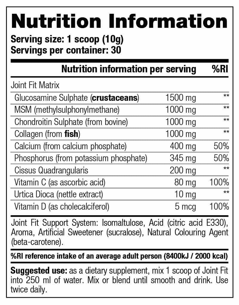 Gebruiksaanwijzing: mix 1 maatschepje Joint Fit in 250 ml water. Roer of shake dit totdat het poeder volledig is opgelost. Tweemaal daags gebruiken.