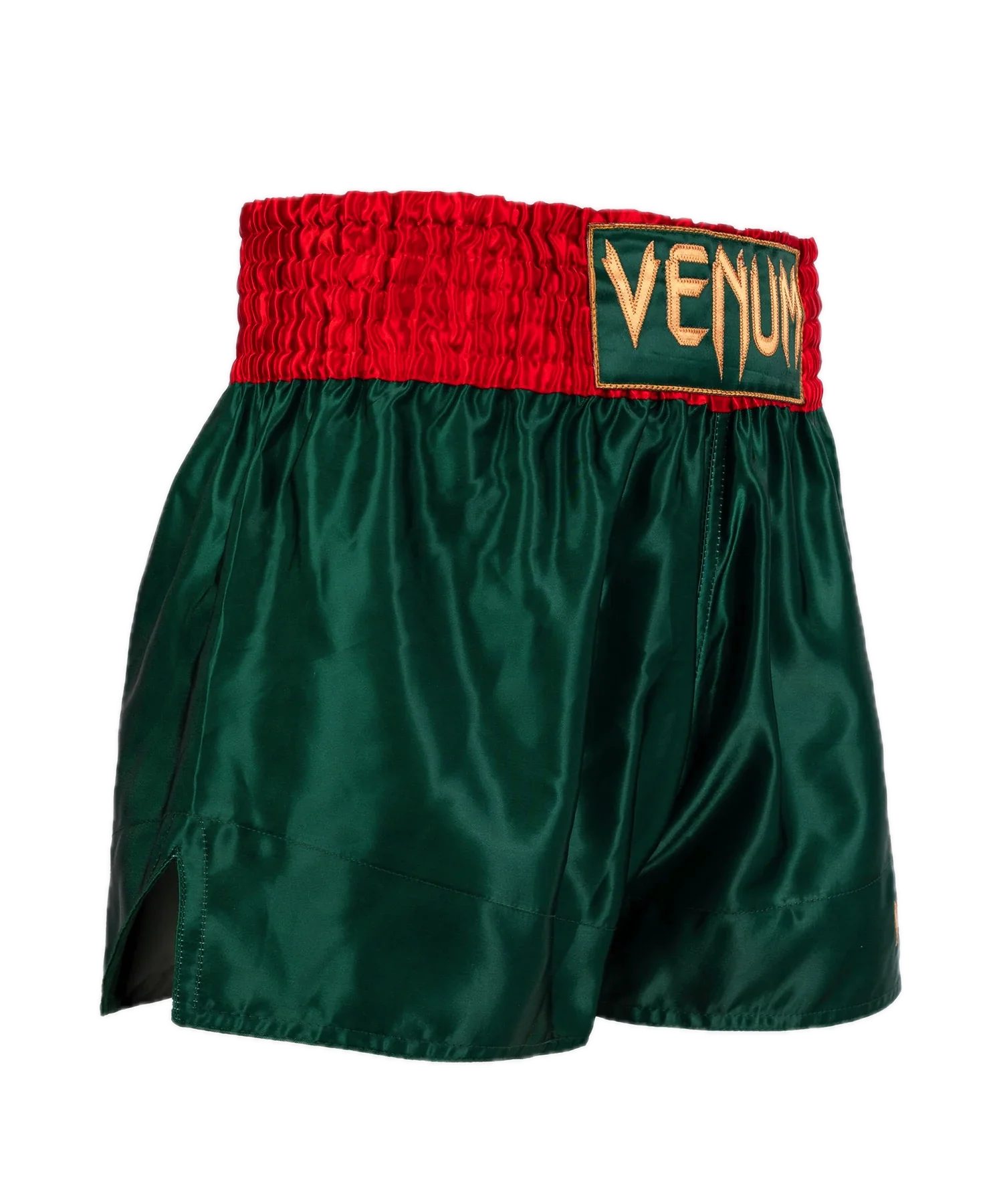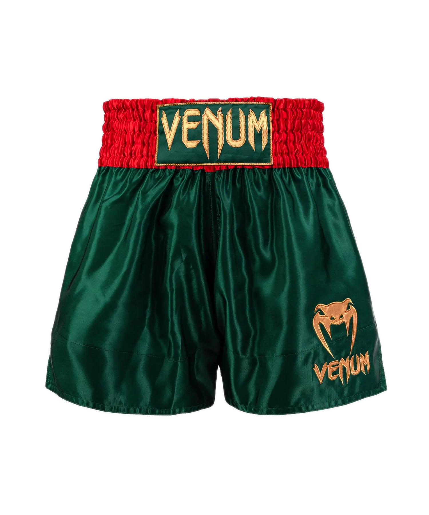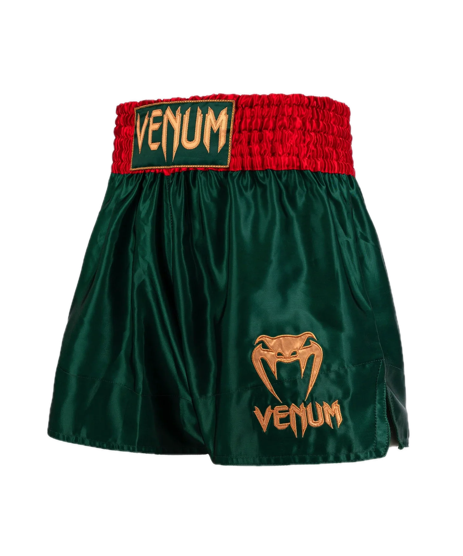 Deze Muay Thai Classic shorts in bosgroen hebben een strakke uitstraling, met nette afwerkingen en het onmiskenbare Venum-logo in goud op de taille en het been.