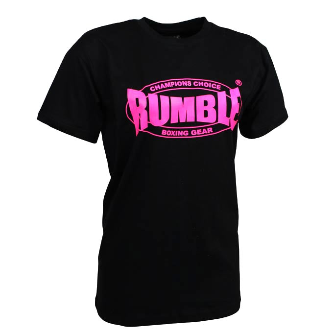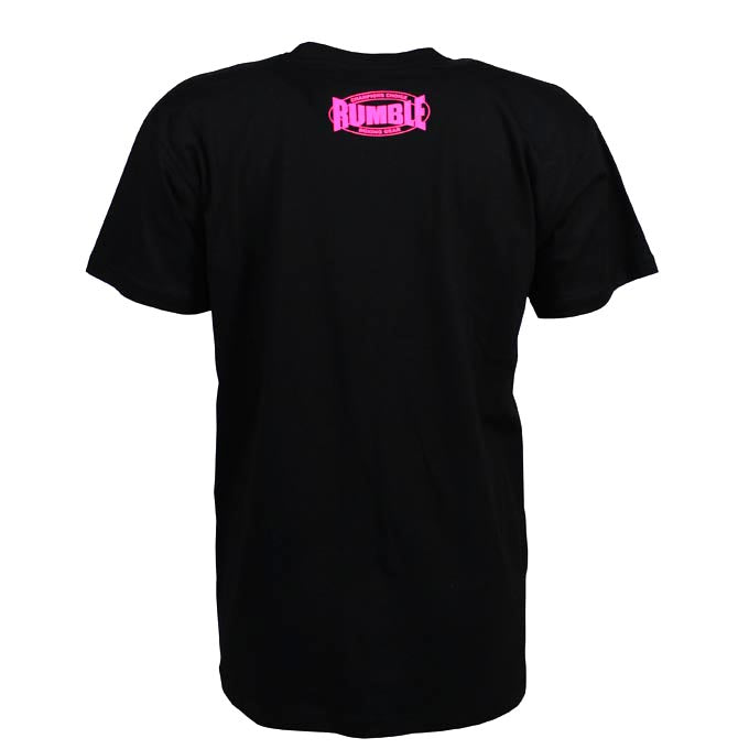 Rumble T-shirt in het zwart met 2 prints, groot voorop en klein op de achterkant.Hoogwaardig kwaliteit T-shirt met ronde hals en het ontwerp in NEON PINK print. Verkrijgbaar in verschillende maten.