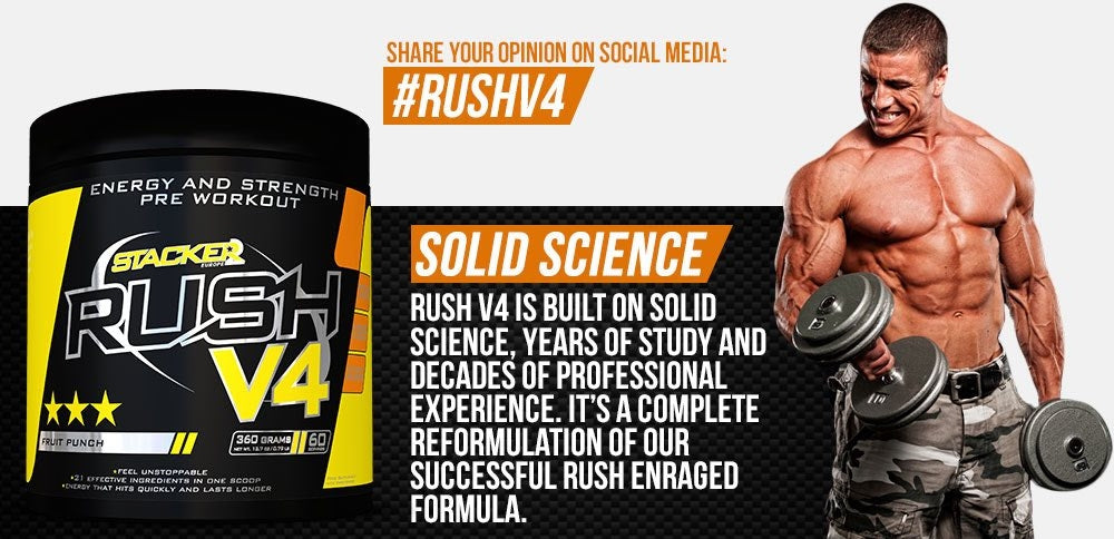 RUSH V4 is dermate krachtig samengesteld, dat we kunnen spreken over de sterkste en meest effectieve pre-workout formule die vandaag de dag verkrijgbaar is. De ontwikkelingen staan niet stil en er wordt veel onderzoek gedaan naar prestatieverhogende extracten en de beste combinaties van stoffen die energie, kracht en focus tot het maximale verhogen. RUSH V4 is het resultaat van deze continue zoektocht. RUSH V4 is samengesteld op basis van keiharde wetenschap, jaren van onderzoek en decennia van consumentenervaringen gekoppeld aan de input van topsporters.